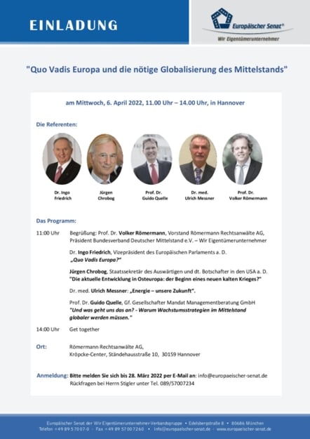 Die drängendsten Themen für den Mittelstand standen auf der Tagsesordnung des Senats- und Unternehmertreffens unserer Verbandsgruppe Wir Eigentümerunternehmer am 6. April in Hannover. Die Ereignisse hatten sich überschlagen, seit wir dieses Treffen geplant haben: Die Situation um die Ukraine spitzte sich schon länger zu, deshalb hatten wir die Situation in Europa und die Folgen dieses Konflikts ganz nach vorne auf die Agenda gesetzt. Durch die kriegerischen Ereignisse in der Ukraine hatten unsere Themen leider an fürchterlicher Dramatik gewonnen. Aber es ging nicht nur um den Ukraine-Krieg und die Zukunft Europas, sondern auch um zwei weitere, damit indes verknüpfte wichtige Aspekte der Zukunft Europas und unseres Mittelstandes: um das Thema Energie und die Globalisierung des Mittelstands.